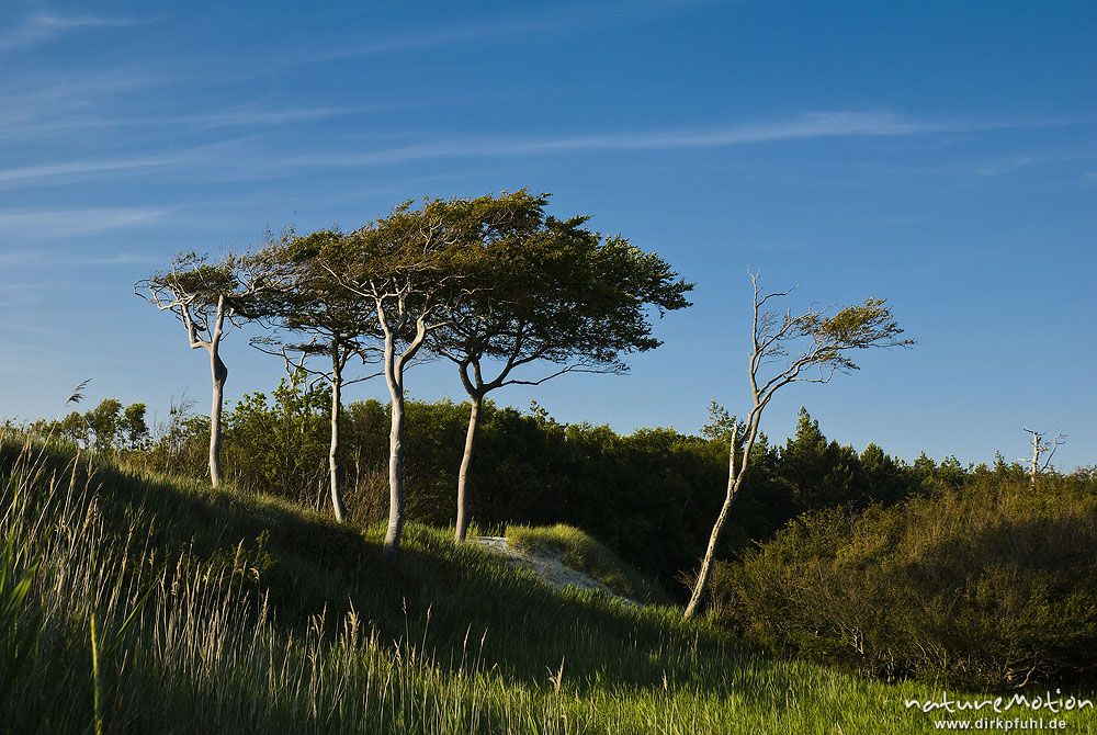 Bäume an der Dünenkante, vom Wind gebeugt, Windflüchter, Darsser Weststrand, Darß, Zingst, Deutschland