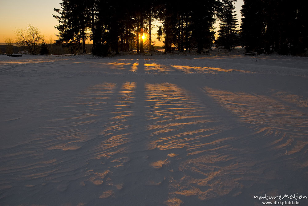 Bäume werfen lange Schatten auf Schneedecke, Sonnenuntergang, Sonnenberg Harz, Deutschland