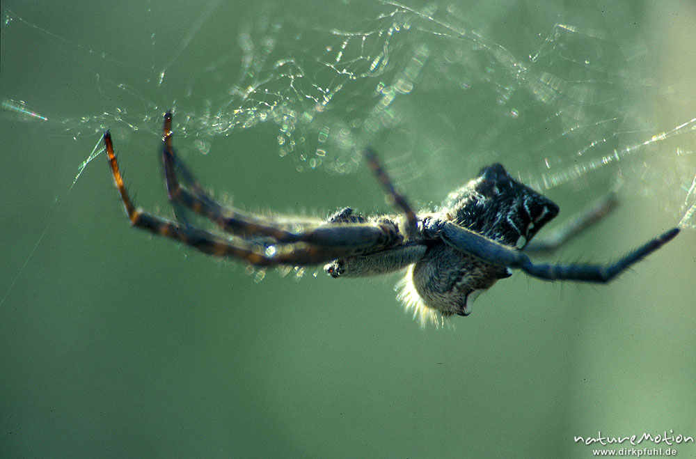 (?) Baldachinspinne, Kanarische Inseln Ansicht von Seite, hängt Kopfüber im Netz, Kolonien in Opuncien, Gomera, Gomera, Spanien