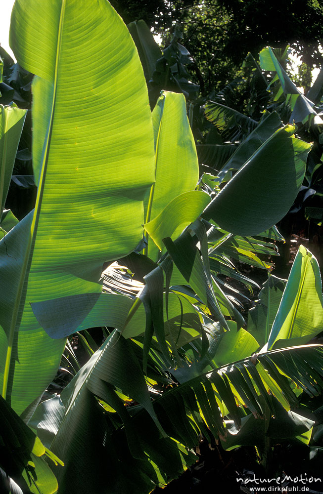 Banane, Dessertbanane, Musa × paradisiaca, Musaceae, Bananenblätter im Gegenlicht, Valle Gran Rey, Calera, Gomera, Spanien