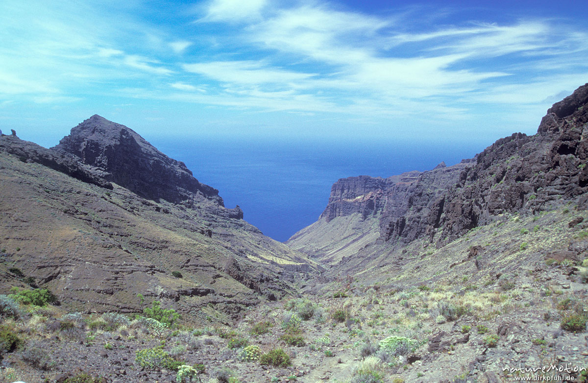 Baranco bei Alujera, Blick zur Küste, Gomera, Spanien