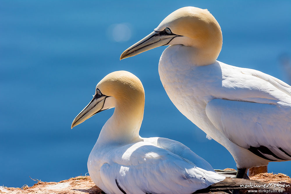 Basstölpel, Morus bassanus, Tölpel (Sulidae), Brutpaar an ihrem Nest, Lummenfelsen, Helgoland, Deutschland