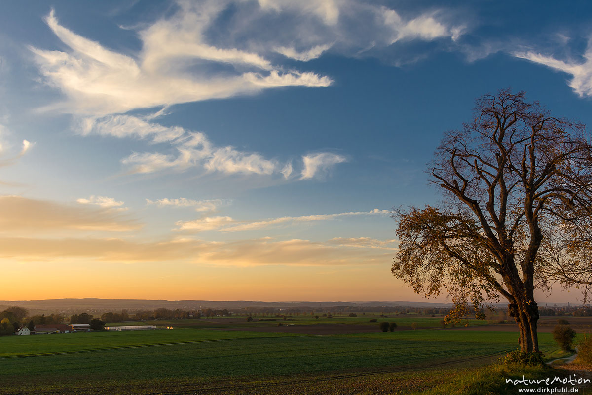 Baum am Wegrand, Felder, Abendlicht, Wolkenzug, Leineauen, Göttingen, Deutschland