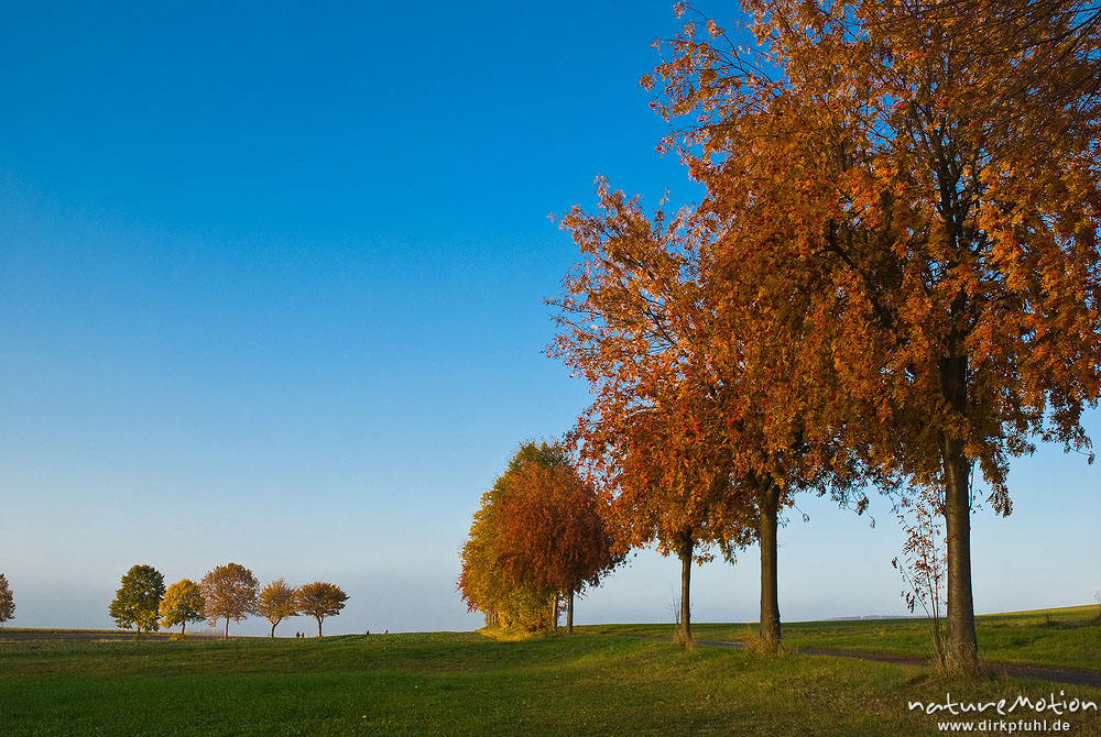 Baumreihe am Wegrand, Eberesche, Vogelbeere, Sorbus aucuparia, Rosengewächse (Rosaceae), Stämme, mit rot gefärbtem Herbstlaub und Früchten, Abendlicht, Leineauen südlich Göttingen, Göttingen, Deutschland
