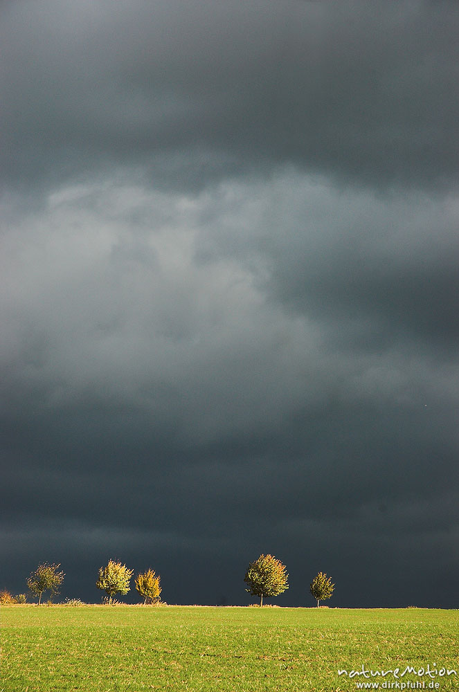Baumreihe vor dunklen Regenwolken, Leinetal, Göttingen, Deutschland