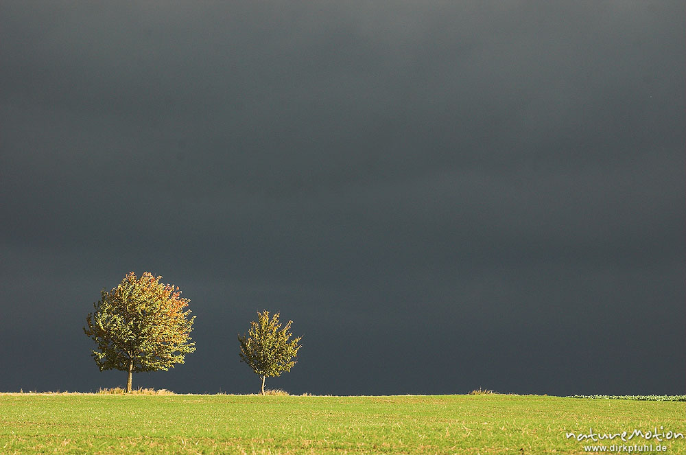 Baumreihe vor dunklen Regenwolken, Leinetal, Göttingen, Deutschland