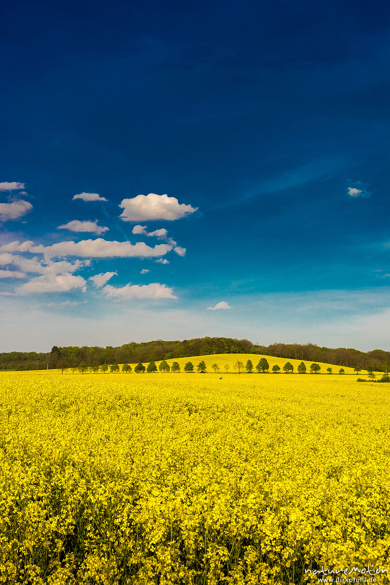 Baumreihe zwischen blühenden Rapsfeldern, Reinhausen bei Göttingen, Deutschland