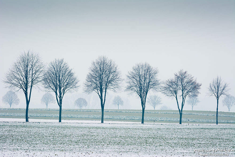Baumreihen entlang Landstra?e, leichte Schneebedeckung, tr?ber Wintertag, Niedernjesa, G?ttingen, Deutschland