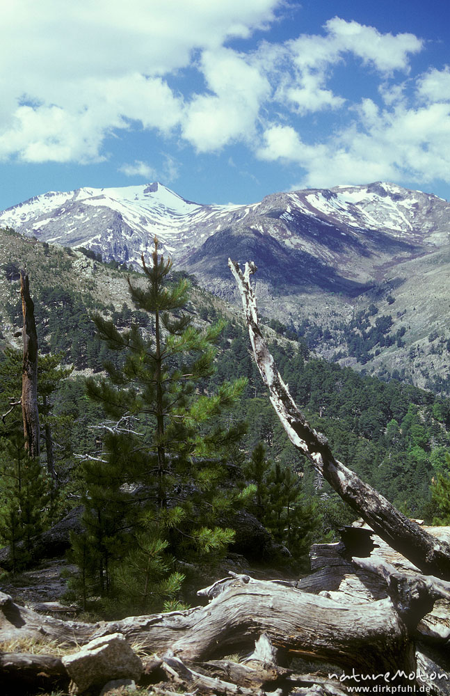 Baumskelett vor schneebedeckten bergen, Tavignano-Tal, Korsika, Frankreich