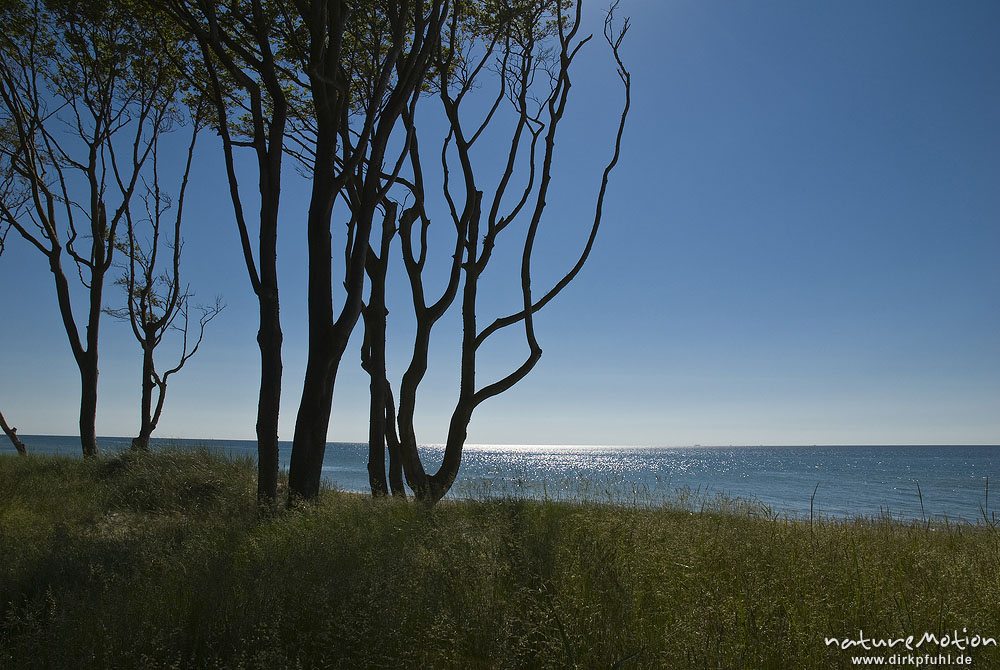 Baumstämme im Gegenlicht, Blick aufs Meer, Lichtreflexe, Darsser Weststrand, Darß, Zingst, Deutschland