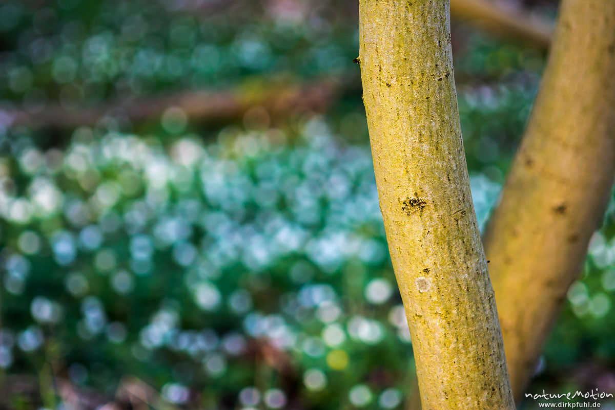 Baumstämme, im Hintergrund unscharf blühende Buschwindröschen, Kehr, Göttingen, Deutschland