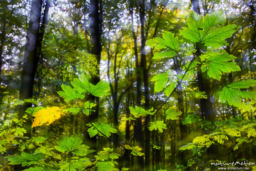 Berg-Ahorn, Acer pseudoplatanus, Aceraceae, beginnende Herbstfärbung, Wald am Hünstollen, Doppelbelichtung scharf/unscharf, Ebergötzen bei Göttingen, Deutschland