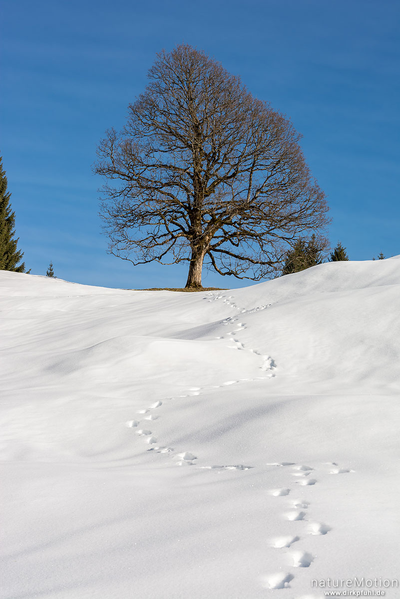 Berg-Ahorn, Acer pseudoplatanus, Aceraceae, einzeln stehender Baum im Schnee, Hochlaite, Oberstdorf, Deutschland