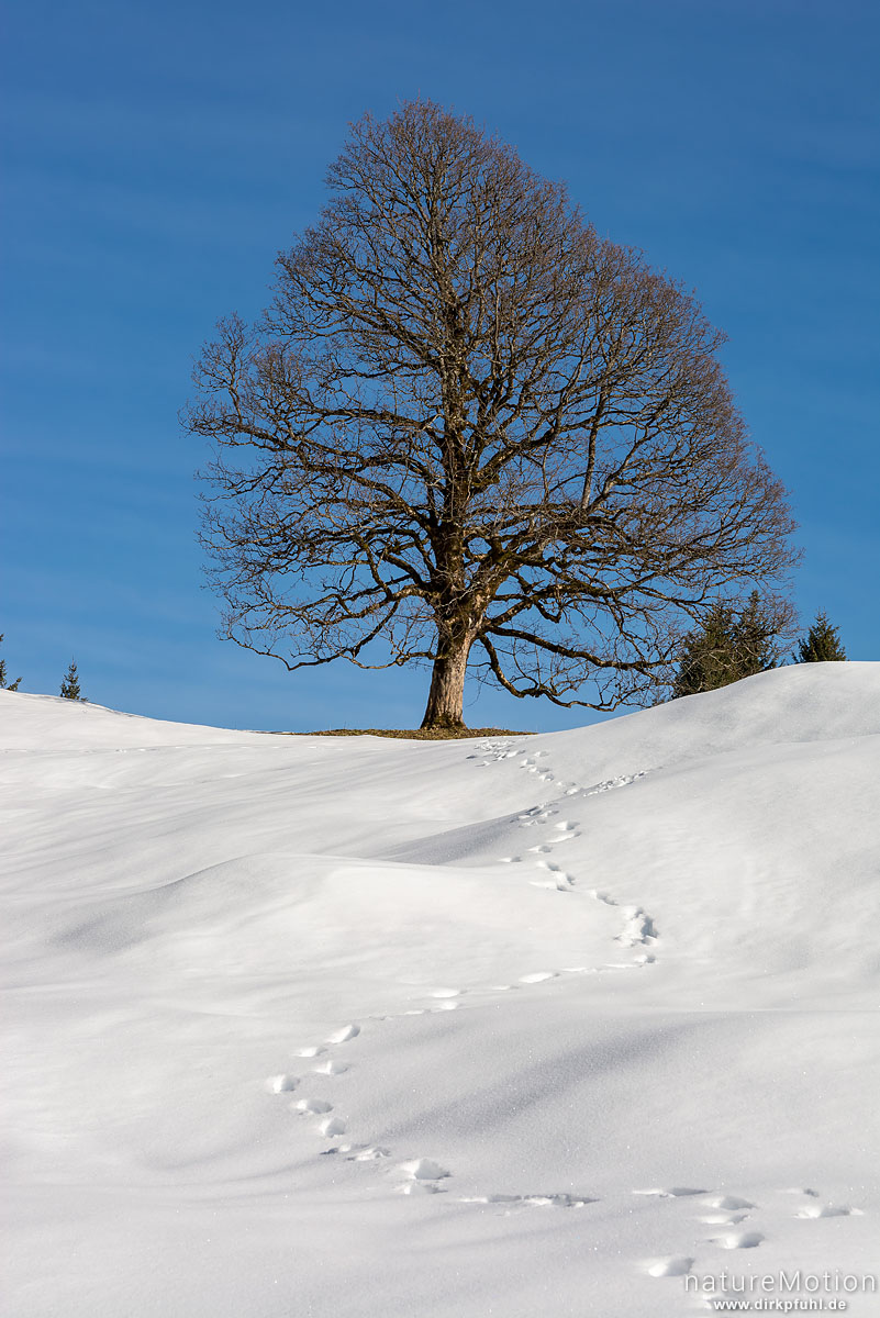 Berg-Ahorn, Acer pseudoplatanus, Aceraceae, einzeln stehender Baum im Schnee, Hochlaite, Oberstdorf, Deutschland