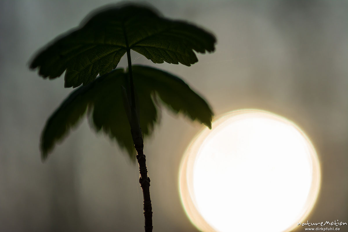 Berg-Ahorn, Acer pseudoplatanus, Aceraceae, Spross, Schössling, Blätter eines frischen Triebes im Gegenlicht der untergehenden Sonne, Kehr, Göttingen, Deutschland
