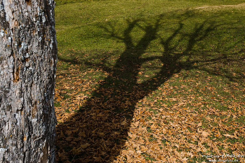 Berg-Ahorn, Acer pseudoplatanus, Aceraceae, Stamm, Schatten und Laub am Boden, Klais Oberbayern, Deutschland