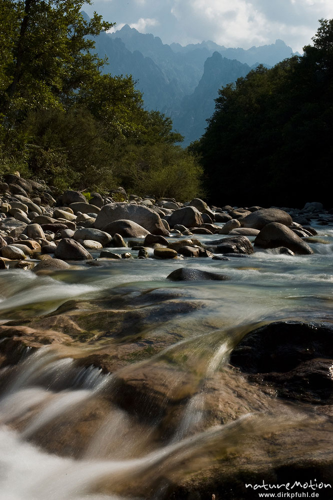 Bergbach, fließendes Wasser, rundgeschliffene Steine, Asco-Tal, Blick auf Berge, Korsika, Frankreich