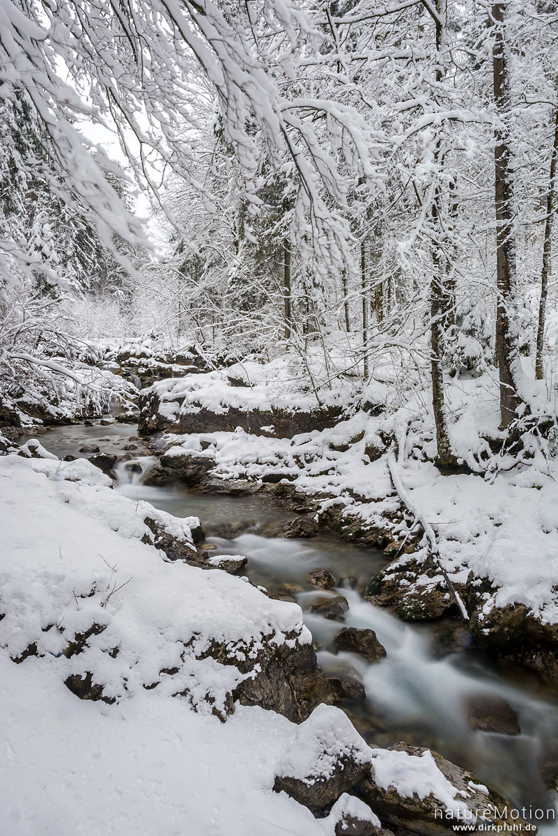Bergbach im Winterwald, Oybach-Tal, Oberstdorf, Deutschland
