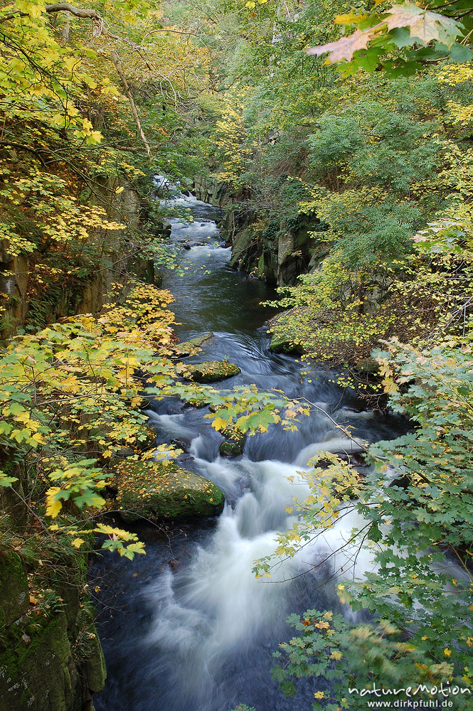 Bergbach, Schlucht im Herbstwald, fließendes Wasser, Teufelsbrücke, Bodetal Bodetal, Deutschland