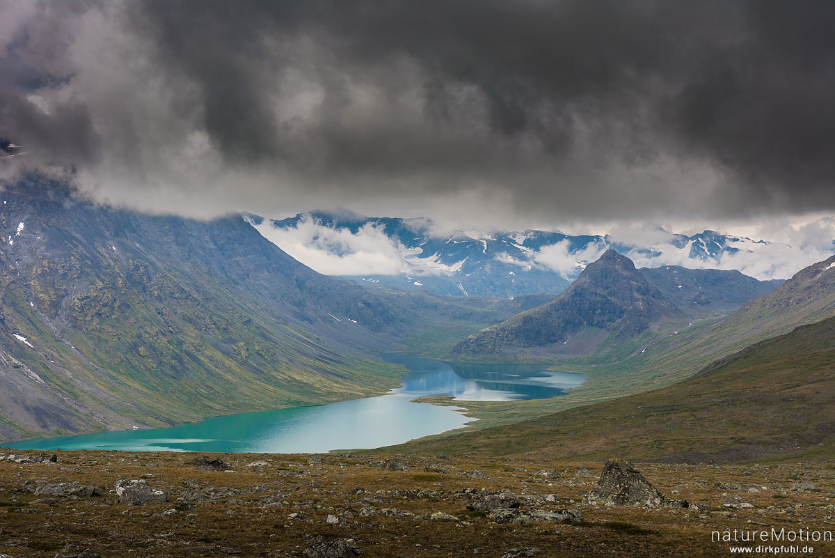 Berge unter Regenwolken, Blick zum See Russvatnet, Wanderweg Glitterheim - Gjendesheim, Jotunheimen, Jotunheimen, Norwegen