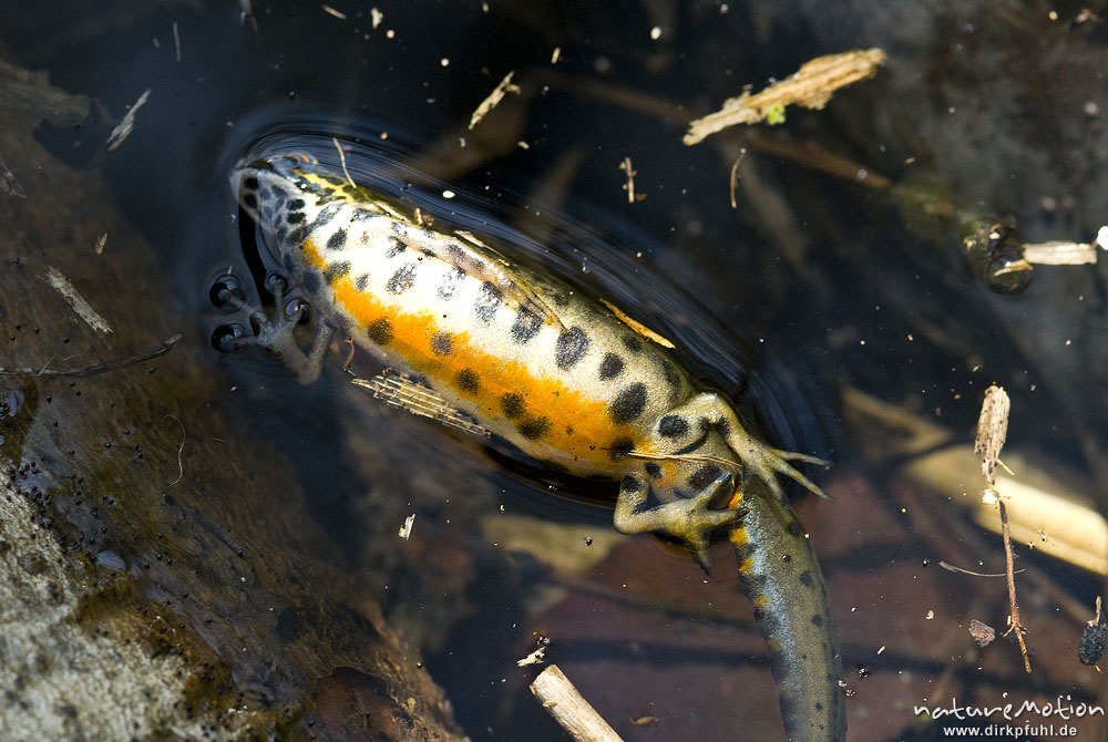 Bergmolch, Triturus alpestris, Echte Salamander (Salamandrinae), Männchen, totes Tier in Wiesentümpel, A nature document - not arranged nor manipulated, Ebergötzen bei Göttingen, Deutschland
