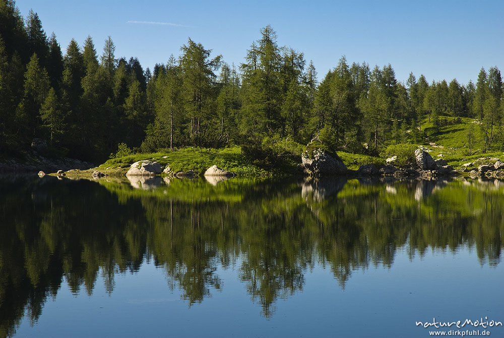 Bergsee, Dvojno jezero (Doppelsee), Morgenlicht, aufgehende Sonne, Tal der sieben Seen, Triglav-Nationalpark, Slowenien