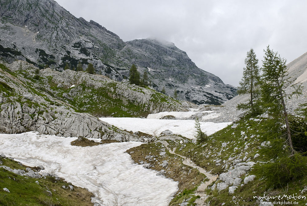 Bergtal mit Schneefeldern und Schutthängen, Wanderweg, Tal der sieben Seen, Triglav-Nationalpark, Slowenien
