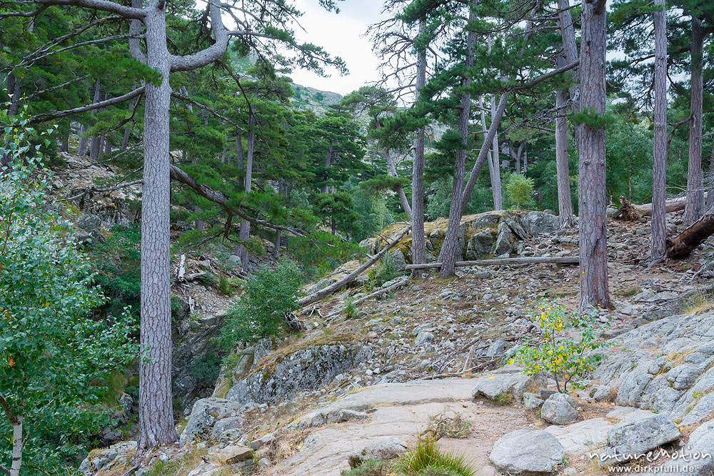 Bergwald mit Schwarzkiefern, Valdu Niellu, Wanderung Forsthaus Poppaghia zum Lac de Nino, Korsika, Frankreich