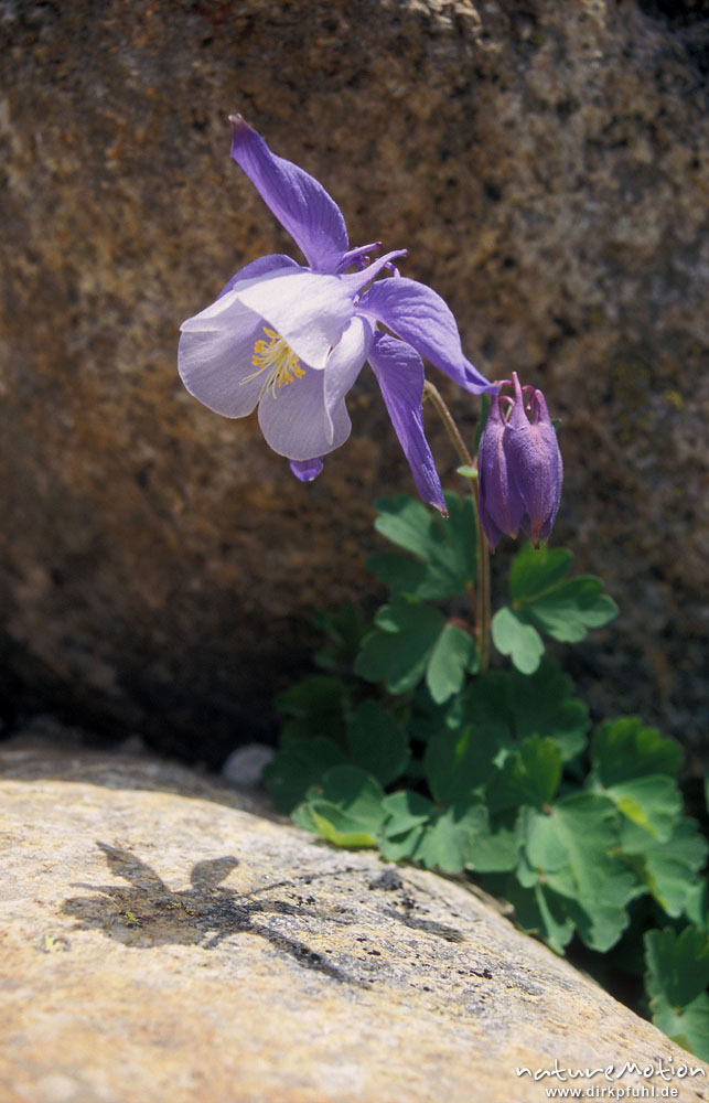 Bernards-Akelei, Aquilegia bernadii, vielleicht auch Aquilegia vulgaris, Hahnenfußgewächse (Ranunculaceae), Blüte mit Schlagschatten auf Fels, Restonica-Tal, Korsika, Korsika, Frankreich