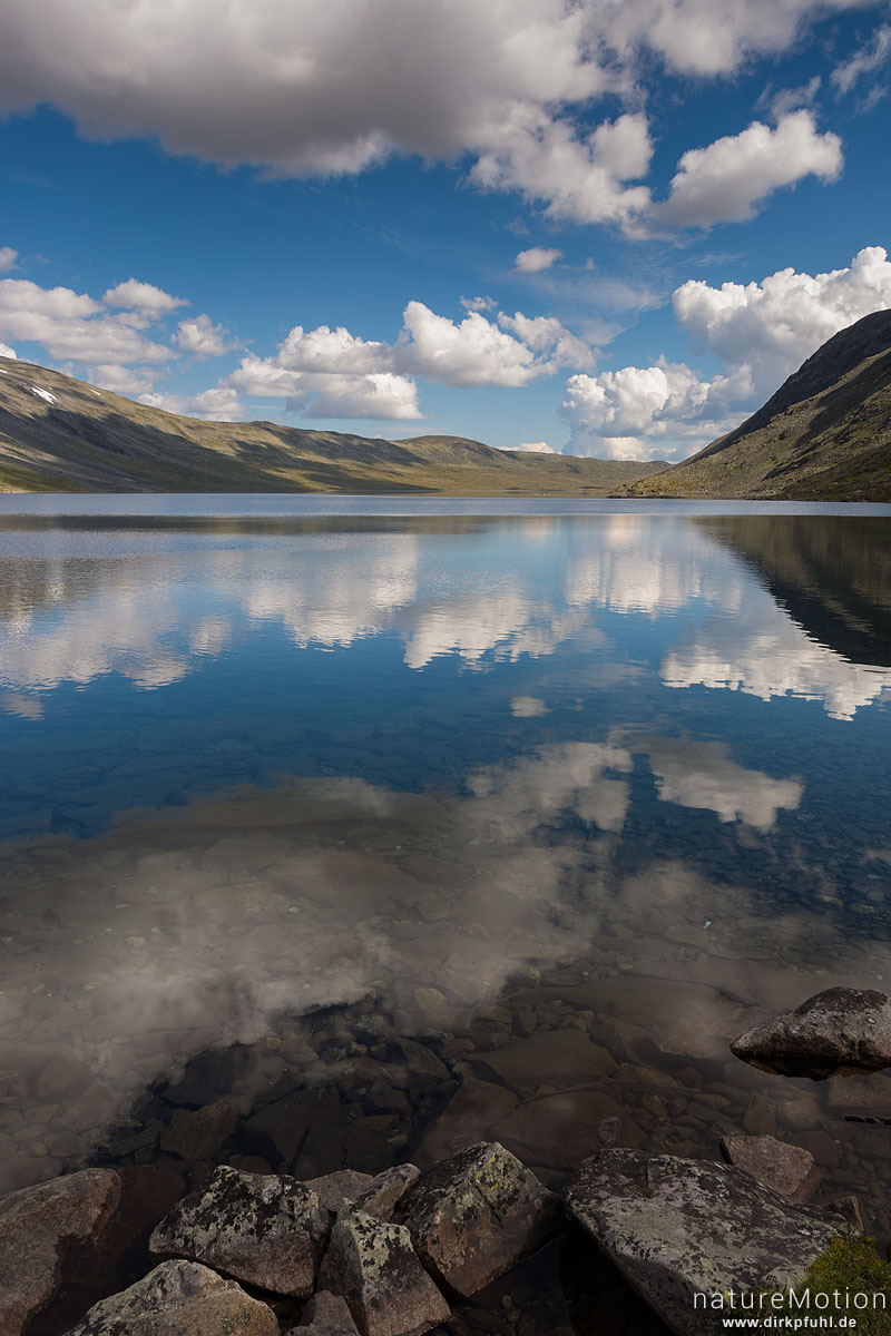 Bessvatnet, Wolken spiegeln sich in der Wasseroberfl?che, Bessegengrat, Jotunheimen, Norwegen