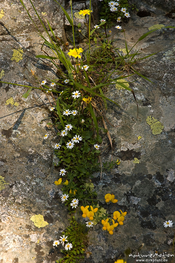 bewachsene Felsspalte, u.a. mit Echtes Zwerggänseblümchen, Spatelgänseblümchen, Bellium bellidioides, Korsika, Frankreich