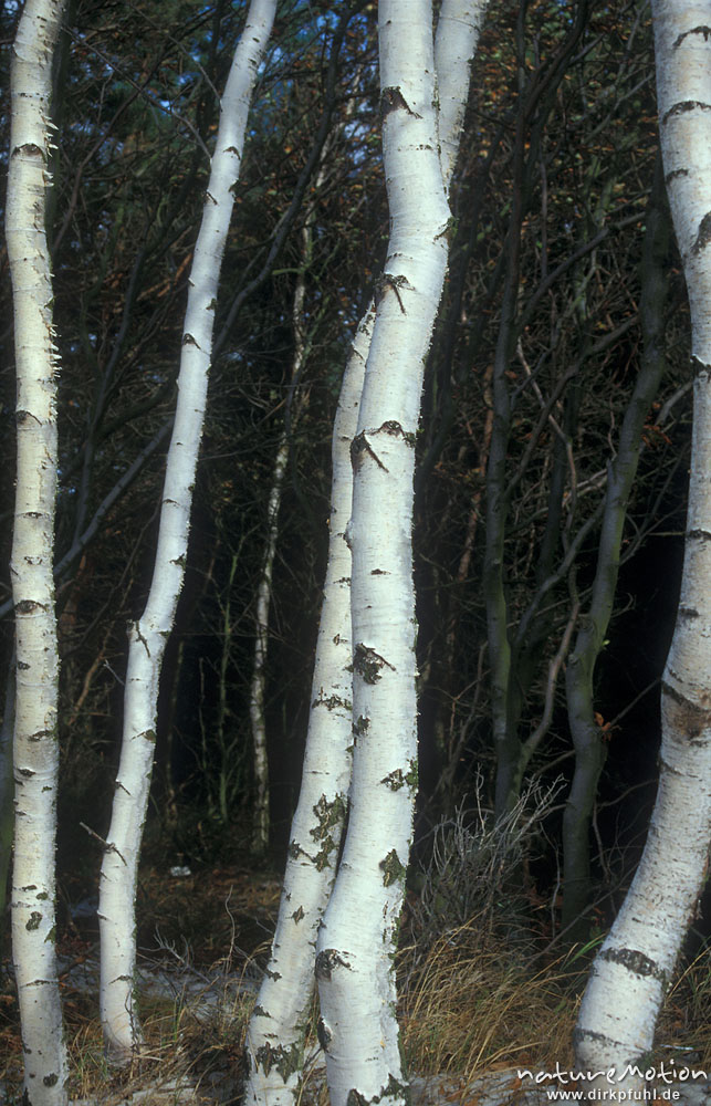 Birke, Hängebirke, Sandbirke, Betula pendula, Betulaceae, Birkenstämme vor dunklem hintergrund, Darsser Urwald, Darß, Zingst, Deutschland