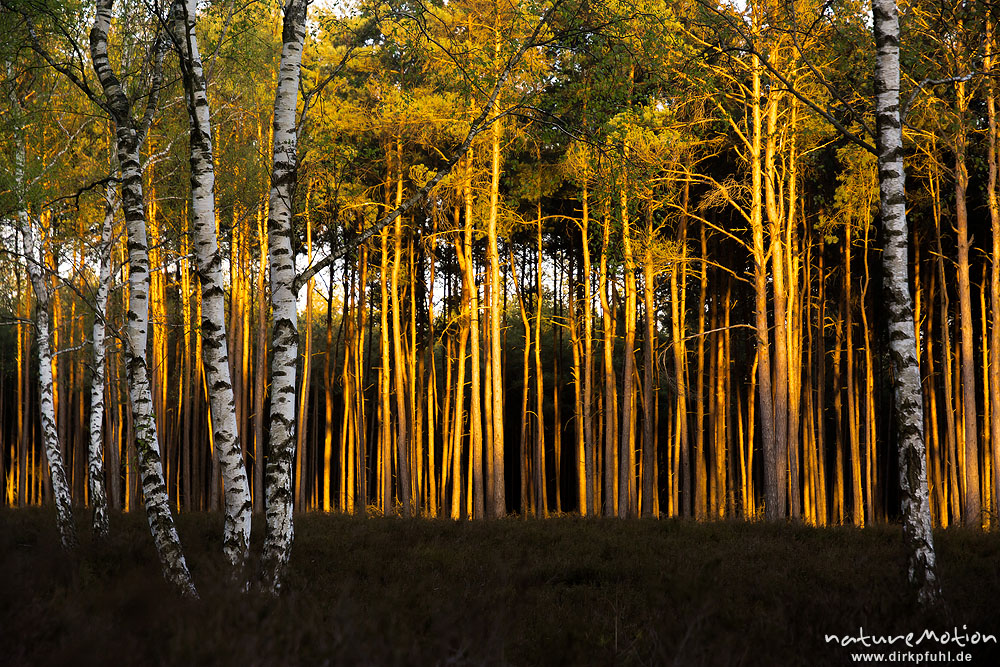 Birken vor Kiefernwald, Abendsonne, Heide bei Trebel, Wendland, Gartow (Wendland), Deutschland