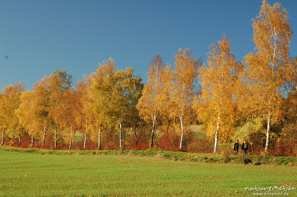 Birkenreihe an Ackerrand, blauer Himmel, herbstfärbung, Herberhausen bei Göttingen Göttingen, Deutschland