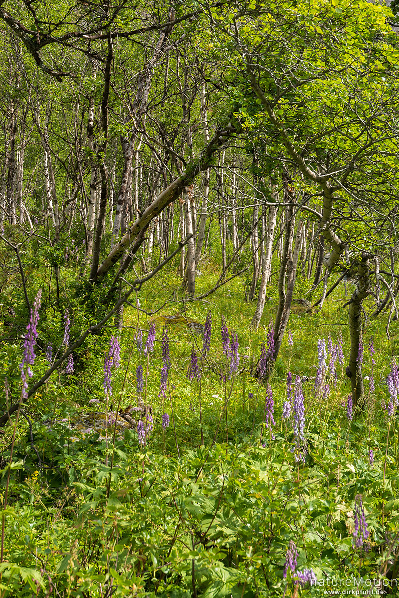 Birkenwald am Ufer des Gjendesee, Moor-Birke, Karpaten-Birke, Betula pubescens, 	Birkengewächse (Betulaceae), im Unterwuchs Blauer Eisenhut, Jotunheimen, Memurubu, Norwegen