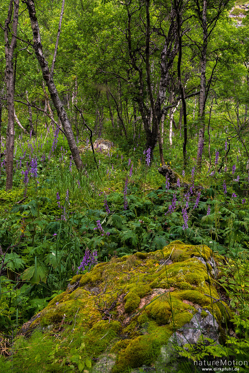 Birkenwald am Ufer des Gjendesee, Moor-Birke, Karpaten-Birke, Betula pubescens, 	Birkengewächse (Betulaceae), im Unterwuchs Blauer Eisenhut, Jotunheimen, Memurubu, Norwegen
