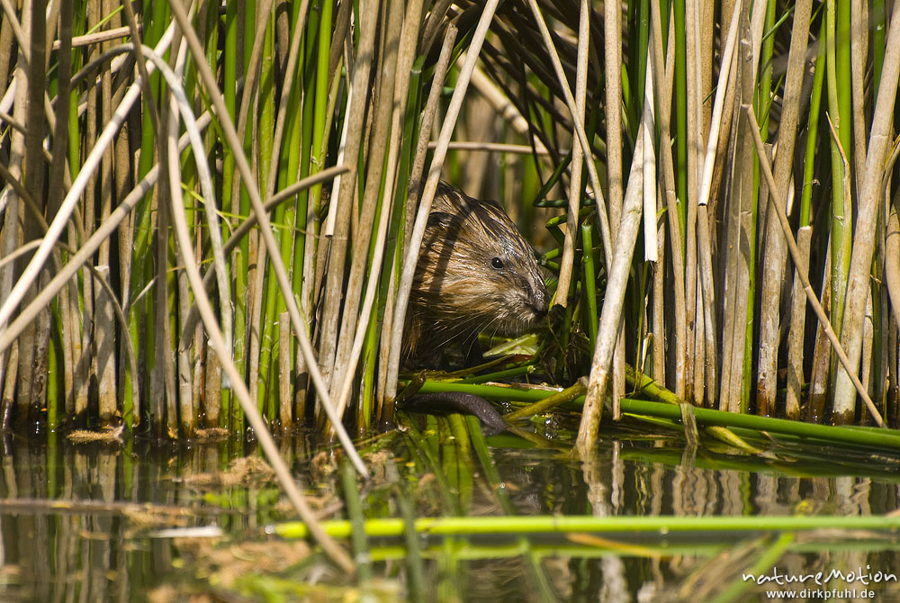 Bisamratte, Ondatra zibethicus, Wühler (Cricetidae), Tier inmitten von Schilf beim sammeln von Pflanzenteilen zum Nestbau, A nature document - not arranged nor manipulated, Seeburger See, Deutschland