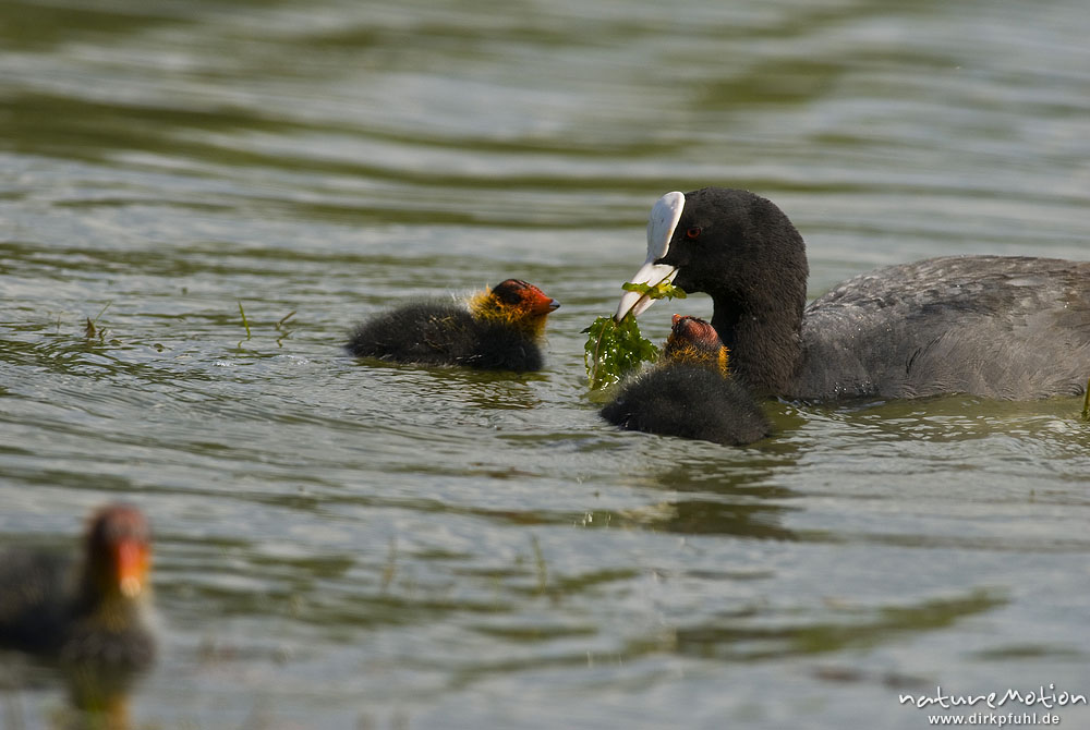 Bläßhuhn, Bläßralle, Fulica atra, Rallidae, Alttier mit Küken, Küken wird gefüttert, Küken mit rotem Kopfgefieder, Kiessee, A nature document - not arranged nor manipulated, Göttingen, Deutschland