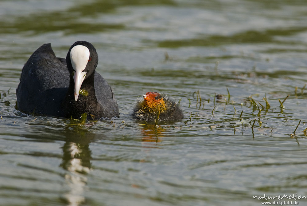 Bläßhuhn, Bläßralle, Fulica atra, Rallidae, Alttier mit Küken, Küken wird gefüttert, Küken mit rotem Kopfgefieder, Kiessee, A nature document - not arranged nor manipulated, Göttingen, Deutschland