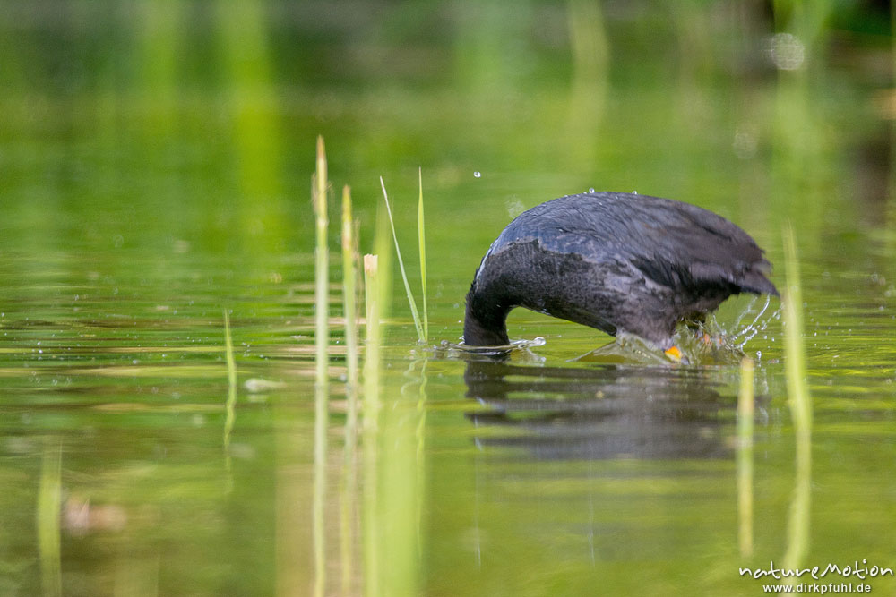 Bläßhuhn, Bläßralle, Fulica atra, Rallidae, Alttier taucht nach Nahrung für Küken, Kiessee, A nature, Göttingen, Deutschland