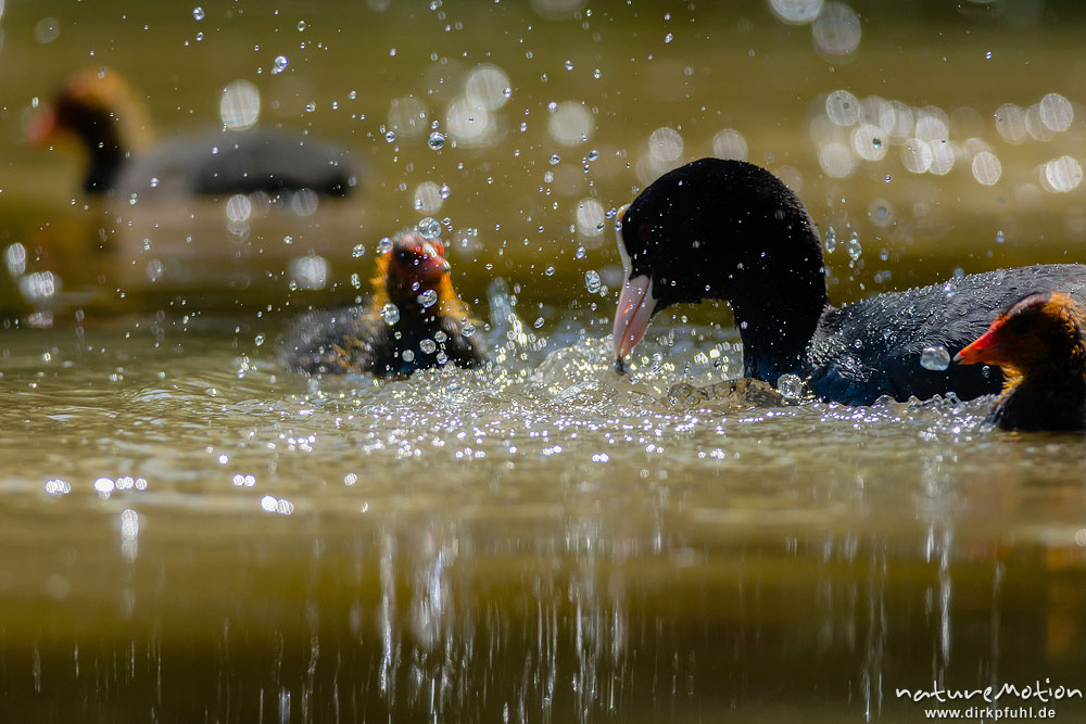 Bläßhuhn, Bläßralle, Fulica atra, Rallidae, Alttiere tauchen nach Wasserpflanzen und füttern ihre Küken, Kiessee, A nature document - not arranged nor manipulated, Göttingen, Deutschland