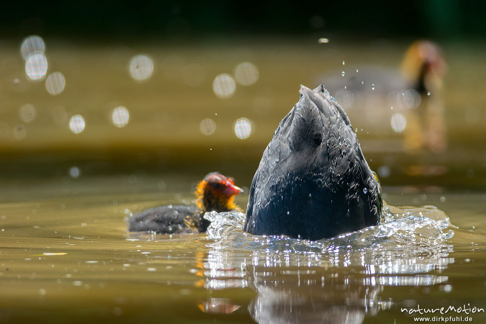 Bläßhuhn, Bläßralle, Fulica atra, Rallidae, Alttiere tauchen nach Wasserpflanzen und füttern ihre Küken, Kiessee, A nature document - not arranged nor manipulated, Göttingen, Deutschland
