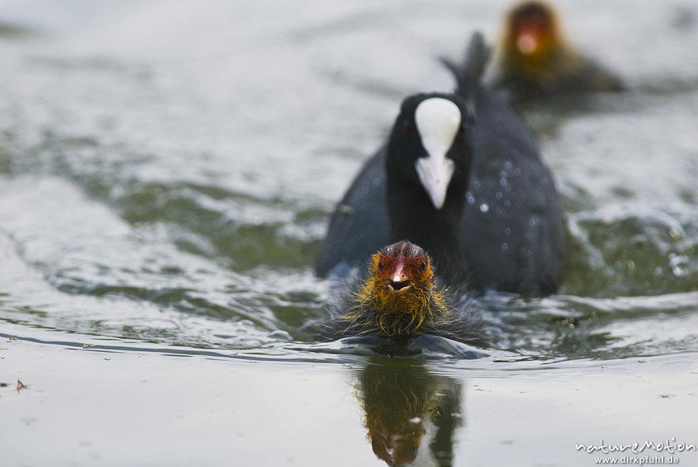 Bläßhuhn, Bläßralle, Fulica atra, Rallidae, fremdes Küken wird von Alttier vertrieben, Kiessee, A nature document - not arranged nor manipulated, Göttingen, Deutschland