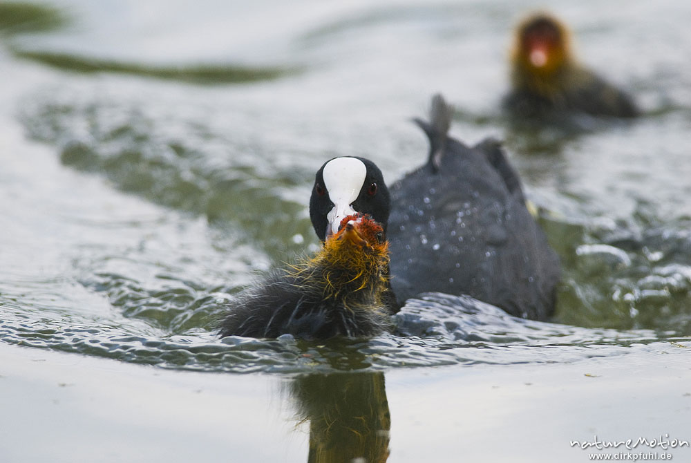 Bläßhuhn, Bläßralle, Fulica atra, Rallidae, fremdes Küken wird von Alttier vertrieben, Kiessee, A nature document - not arranged nor manipulated, Göttingen, Deutschland