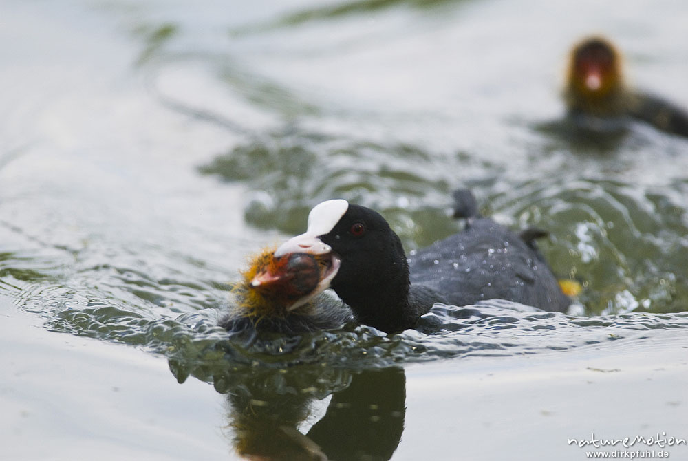 Bläßhuhn, Bläßralle, Fulica atra, Rallidae, fremdes Küken wird von Alttier vertrieben, Kiessee, A na, Göttingen, Deutschland