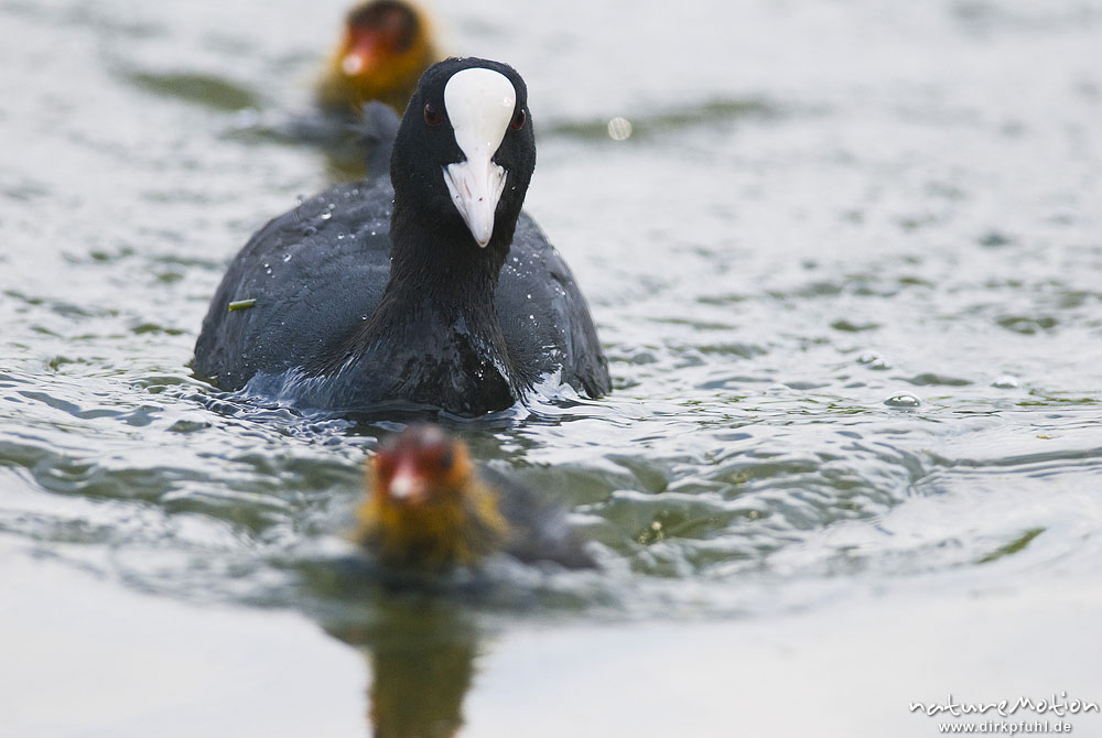 Bläßhuhn, Bläßralle, Fulica atra, Rallidae, fremdes Küken wird von Alttier vertrieben, Kiessee, A nature document - not arranged nor manipulated, Göttingen, Deutschland