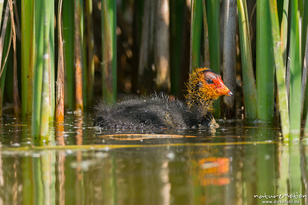 Bläßhuhn, Bläßralle, Fulica atra, Rallidae, Küken im Schilf, Kiessee, A nature document - not arranged nor manipulated, Göttingen, Deutschland