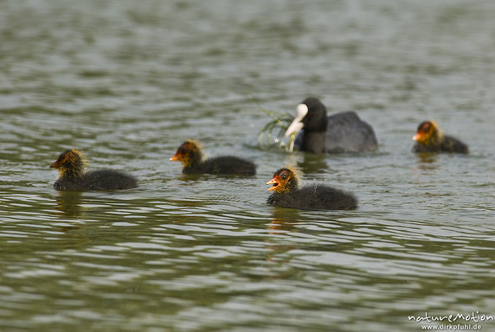 Bläßhuhn, Bläßralle, Fulica atra, Rallidae, Küken mit rotem Kopfgefieder, Alttier holt Wasserpflanzen, Kiessee, A nature document - not arranged nor manipulated, Göttingen, Deutschland