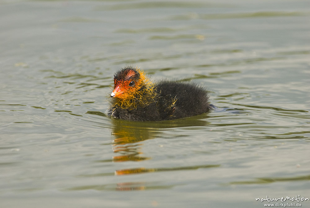 Bläßhuhn, Bläßralle, Fulica atra, Rallidae, Küken mit rotem Kopfgefieder, Kiessee, A nature document - not arranged nor manipulated, Göttingen, Deutschland