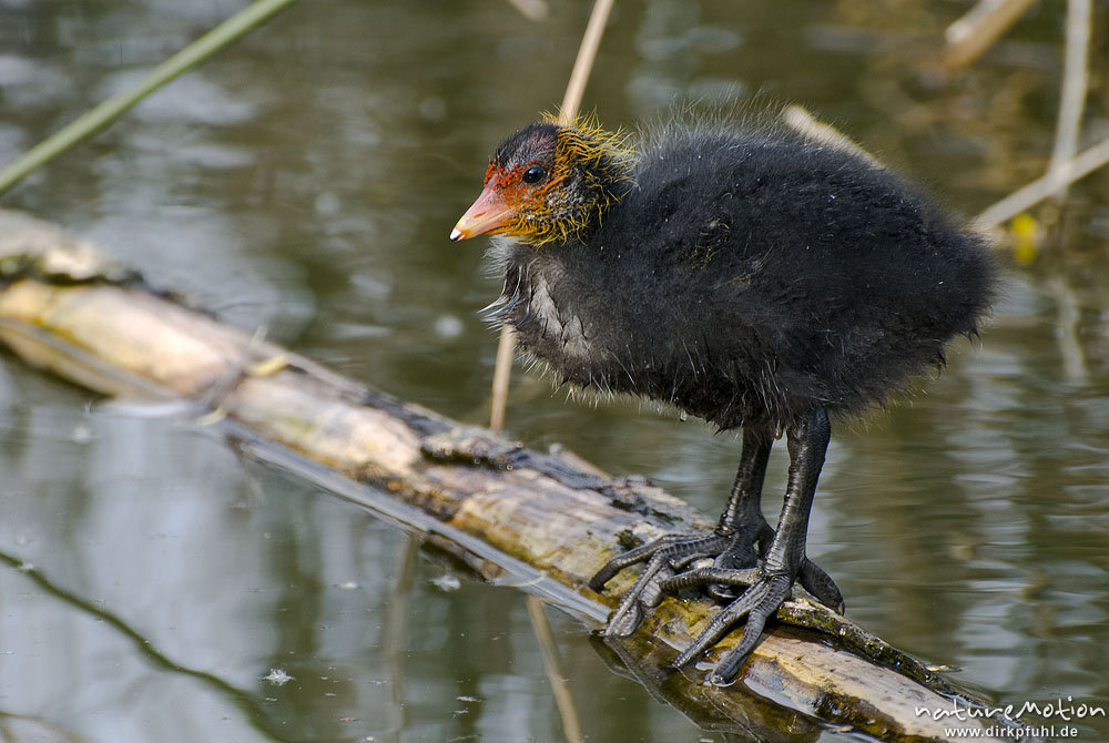 Bläßhuhn, Bläßralle, Fulica atra, Rallidae, Küken, steht auf Baumstamm, Füße gut zu erkennen, A nature document - not arranged nor manipulated, Seeburger See, Deutschland